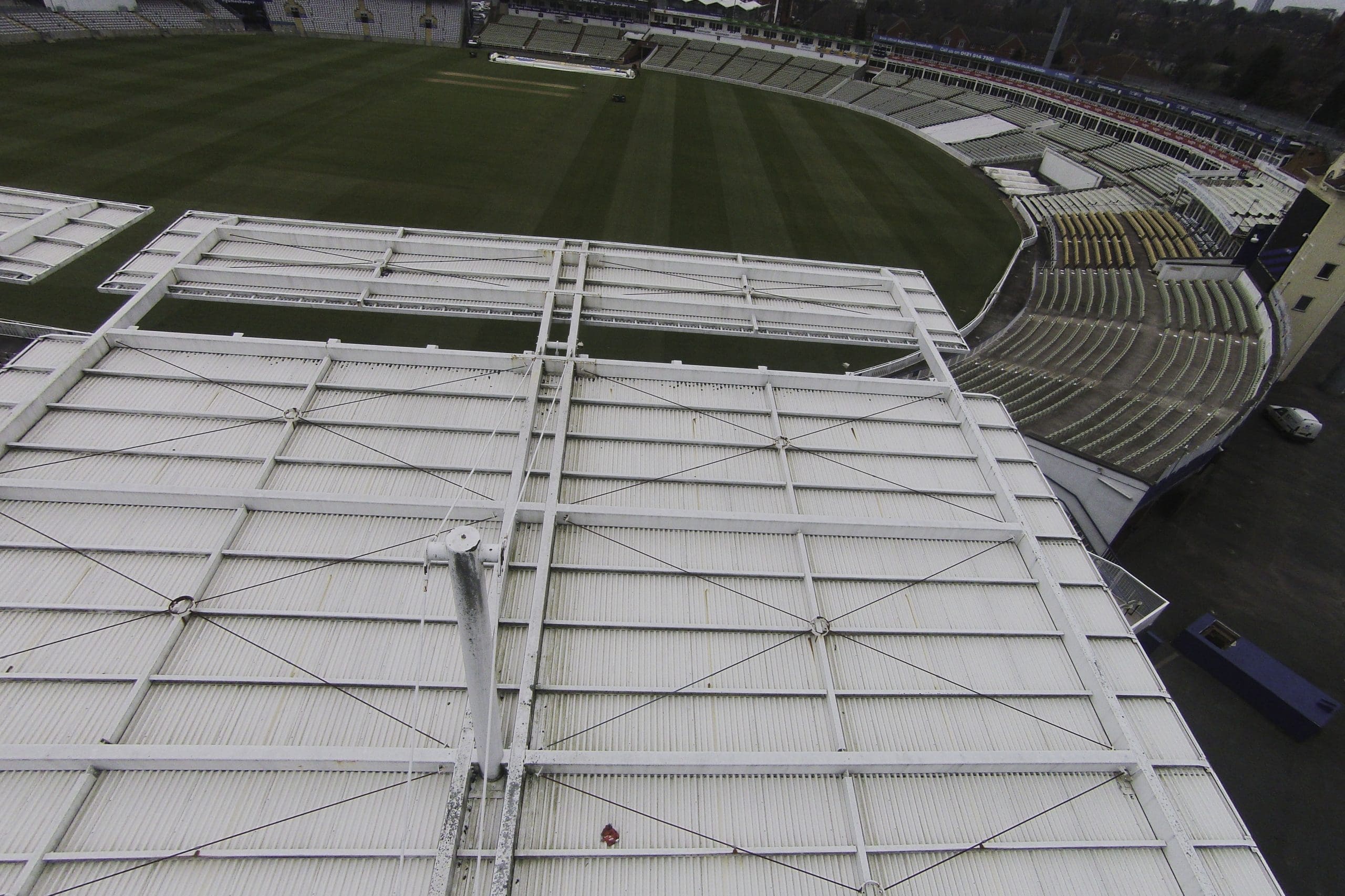 Utilising drone technology: Sky Revolutions deployed its team of fully trained and qualified drone pilots to Edgbaston Cricket Ground. Drones provide a highly efficient method for roof inspections, especially in large or complex structures where traditional scaffolding or manned inspections can be costly, time-consuming, and potentially hazardous.
